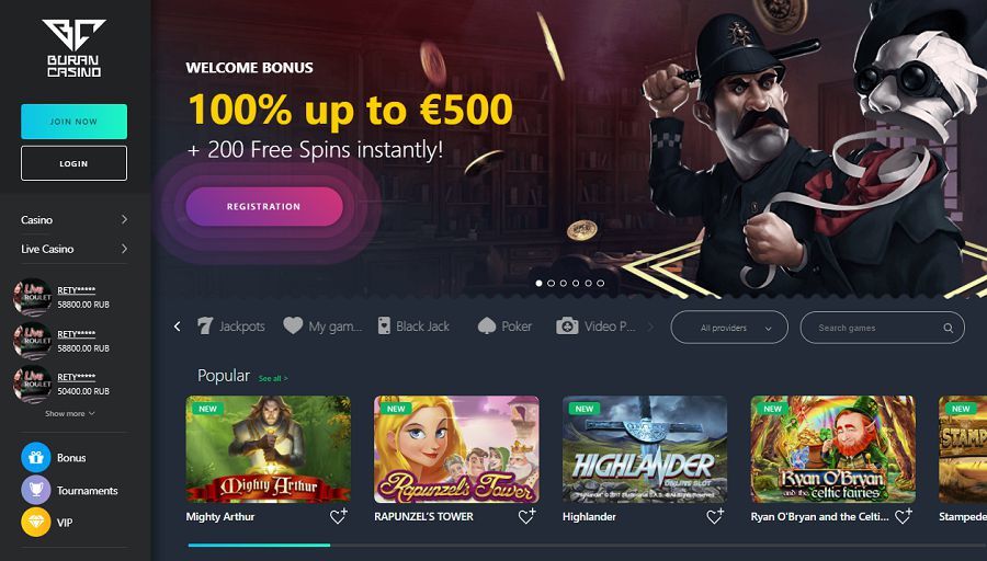 Štedré bonusy s dobrými podmienkami, skvelé hry a príjemná zákaznícka podpora v niekoľkých svetových jazykoch. Toto sú tri najdôležitejšie dôvody, prečo sa zaregistrovať a hrať v Buran Casino. Len bonus za prvý vklad navýši váš účet až o € 500 a dostanete k nemu 200 roztočení zadarmo. Ďalšie bonusy potom na hráča čakajú každý týždeň. V ponuke hier potom nájdete celkom 21 softvérových providerov.